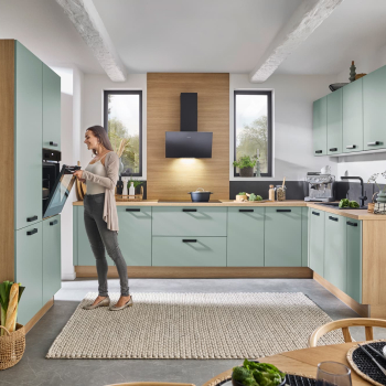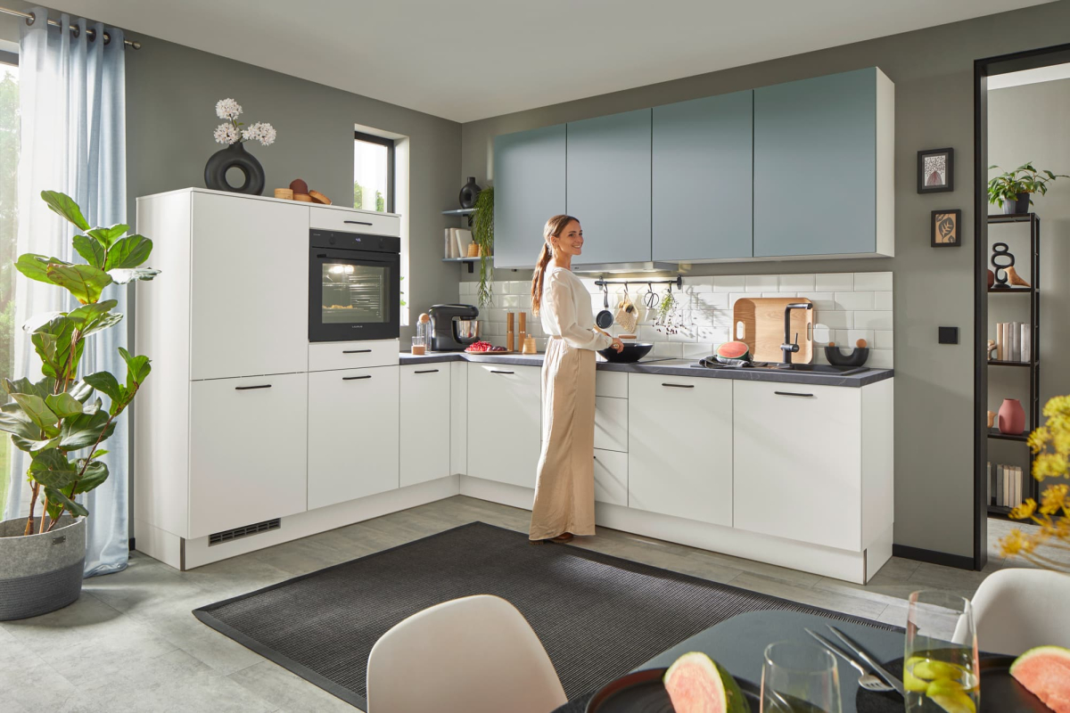 Die U-Form dieser Küche ist wie gemacht für Multitasker: Hier wird gleichzeitig geschnippelt, probiert und geplaudert. Die magnolienweißen Hochglanz-Fronten sorgen für Klarheit und Ruhe, während die warme Evoke Eiche der Arbeitsplatte und Nische Gemütlichkeit ausstrahlt. Dank der durchdachten Hochschrankzeile behält man den Überblick – auch wenn gerade drei Töpfe auf dem Herd stehen und die Familie am Tresen zusammenkommt. Eine Küche, die den Alltag entspannt mitgestaltet.