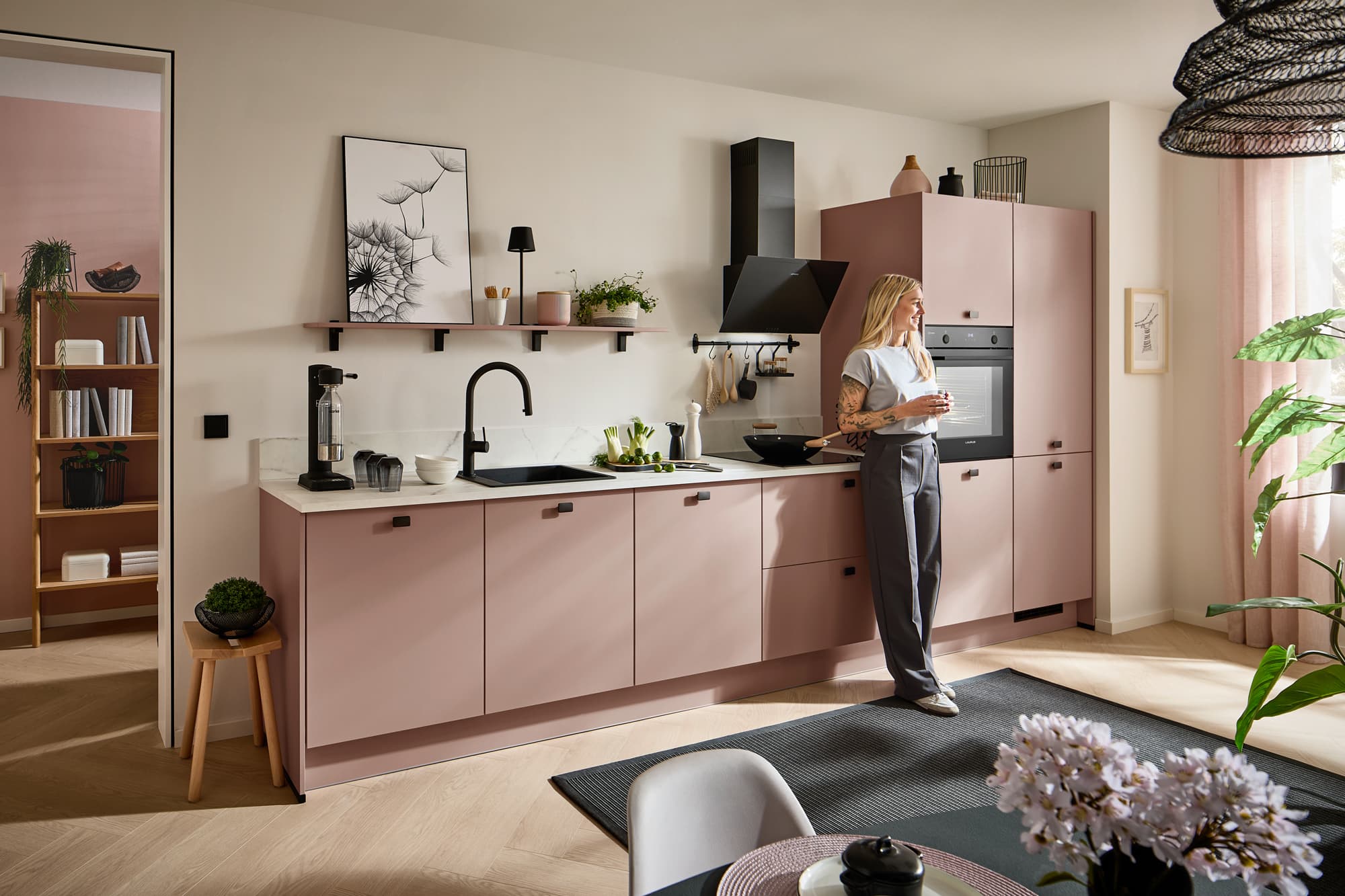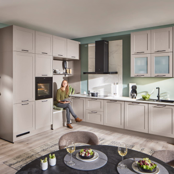 Die U-Form dieser Küche ist wie gemacht für Multitasker: Hier wird gleichzeitig geschnippelt, probiert und geplaudert. Die magnolienweißen Hochglanz-Fronten sorgen für Klarheit und Ruhe, während die warme Evoke Eiche der Arbeitsplatte und Nische Gemütlichkeit ausstrahlt. Dank der durchdachten Hochschrankzeile behält man den Überblick – auch wenn gerade drei Töpfe auf dem Herd stehen und die Familie am Tresen zusammenkommt. Eine Küche, die den Alltag entspannt mitgestaltet.
