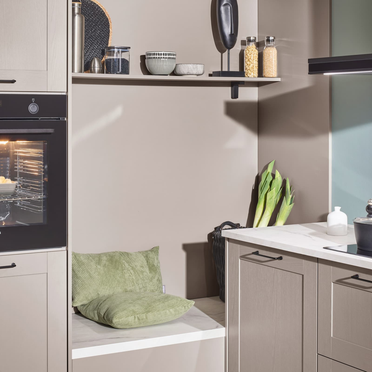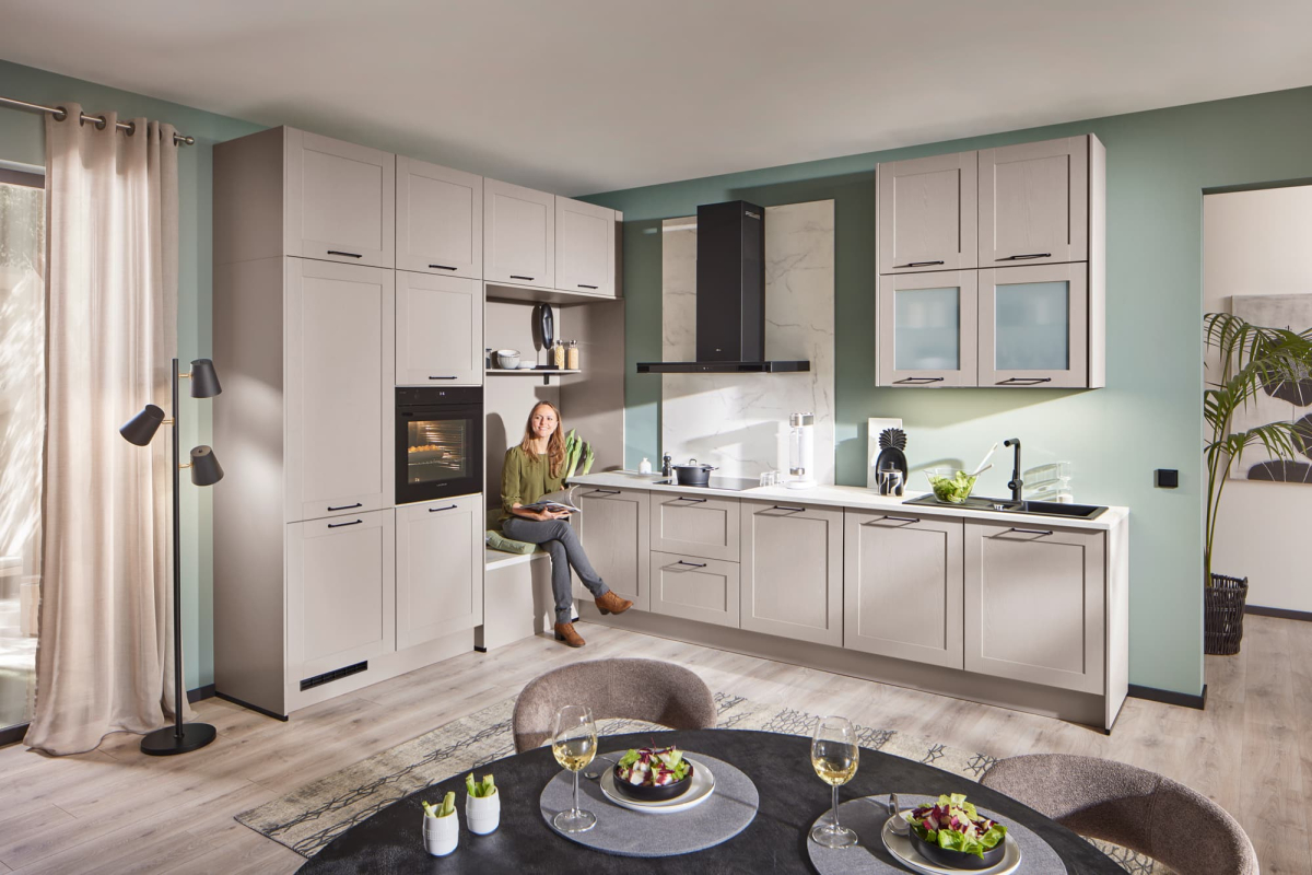 Die U-Form dieser Küche ist wie gemacht für Multitasker: Hier wird gleichzeitig geschnippelt, probiert und geplaudert. Die magnolienweißen Hochglanz-Fronten sorgen für Klarheit und Ruhe, während die warme Evoke Eiche der Arbeitsplatte und Nische Gemütlichkeit ausstrahlt. Dank der durchdachten Hochschrankzeile behält man den Überblick – auch wenn gerade drei Töpfe auf dem Herd stehen und die Familie am Tresen zusammenkommt. Eine Küche, die den Alltag entspannt mitgestaltet.
